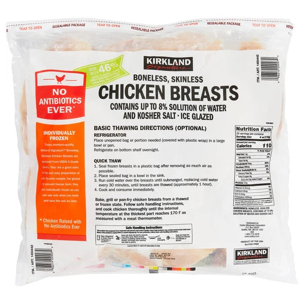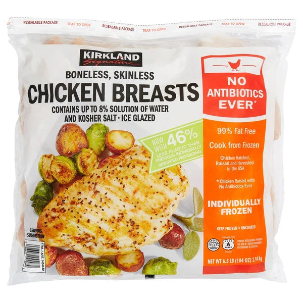 Kirkland Signature Chicken Breasts are boneless, skinless, and come in a 6.5-pound resealable bag. These uncooked chicken breasts are individually frozen for easy portioning and convenience. They’re USDA Grade A, 99% fat free, gluten-free, and prepared with up to 8% solution of water and kosher salt for added juiciness. Raised with no antibiotics ever and sourced entirely from the USA, they’re a reliable choice for healthy, high-protein meals straight from your freezer.