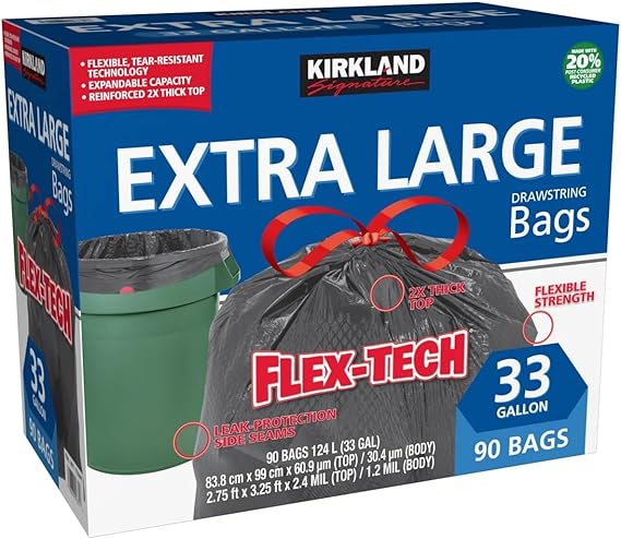 Kirkland Signature Flex-Tech 33 Gallon Kitchen Trash Bag, 90 Count