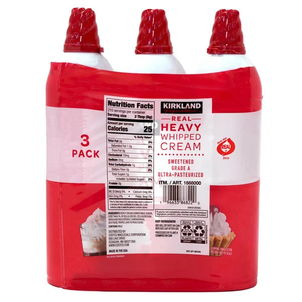 Indulge in the sweet, velvety goodness of Kirkland Signature Heavy Whipped Cream, the perfect finishing touch for desserts, drinks, and everything in between. This Grade A, ultra-pasteurized whipped cream is made with real dairy, offering a luscious texture and lightly sweetened flavor that elevates any treat