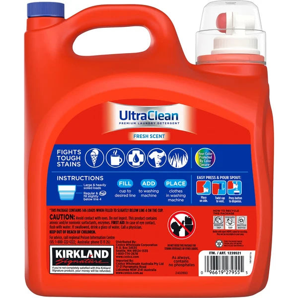 Kirkland Signature Ultra Clean Liquid Laundry Detergent in the 194 fl oz size is designed for both high-efficiency and standard washing machines. It offers powerful stain-fighting performance using Catch & Release Technology, which helps lift and remove tough dirt and odors. With a fresh scent that leaves clothes smelling clean, it’s a popular choice for households looking for value and effectiveness. This bottle provides up to 146 loads, making it a cost-efficient option for large families or frequent laundry needs.
