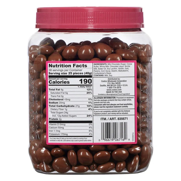 Kirkland Signature Milk Chocolate Raisins feature plump, juicy raisins coated in smooth, creamy milk chocolate for a classic sweet treat. This 3.4-pound container is great for sharing, snacking, or adding to dessert spreads. Each bite offers a satisfying mix of chewy and rich flavors. The resealable packaging helps keep the chocolate-covered raisins fresh and ready to enjoy.