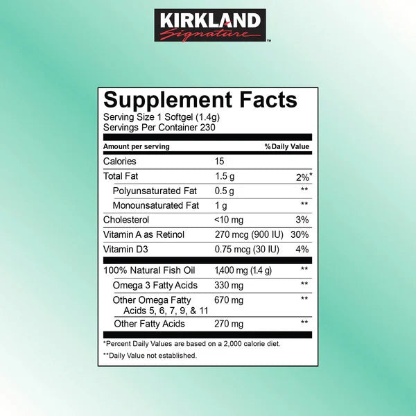Kirkland Wild Alaskan Fish Oil 1400 mg in the 230-count bottle is a premium supplement sourced from sustainably caught Alaskan fish. Each softgel delivers naturally formed triglyceride fish oil, preserving the full spectrum of omega fatty acids including EPA and DHA, along with omega 3, 5, 6, 7, 9, and 11. It also contains naturally occurring astaxanthin and vitamins A and D, offering antioxidant support and promoting heart, brain, and joint health. The oil is extracted using a cold-press method to maintain purity and potency without chemical treatments.