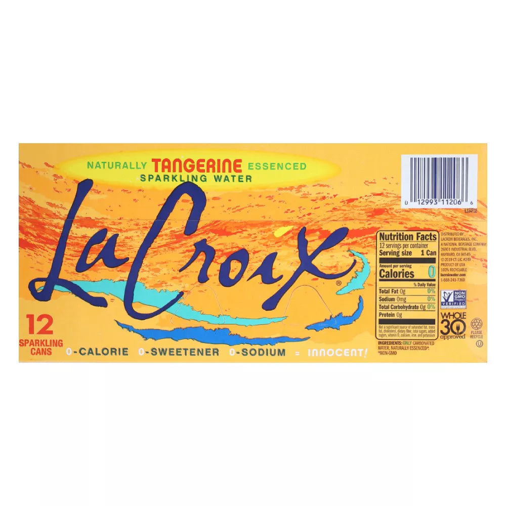 LaCroix Tangerine Sparkling Water is a refreshing and healthy beverage option. This 12-count pack contains 12 oz cans of sparkling water with a hint of natural tangerine essence. It's a guilt-free drink with zero calories, zero sweeteners, and zero sodium, making it a perfect choice for those looking to stay hydrated without any added sugars or artificial ingredients. Enjoy the crisp and clean taste of LaCroix Tangerine Sparkling Water as a refreshing alternative to sugary drinks.