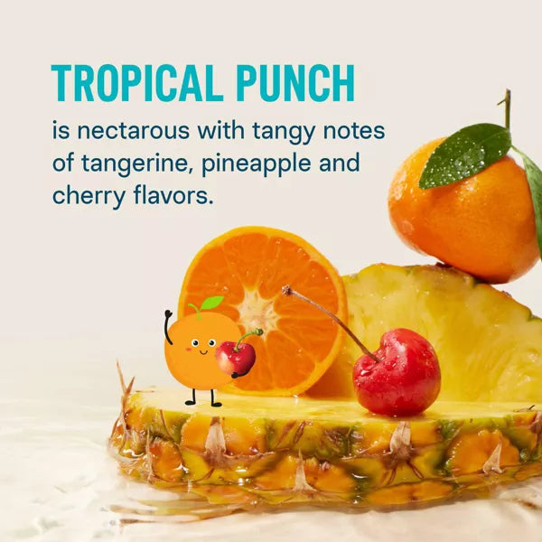 Liquid I.V. Tropical Punch Flavor Hydration Multiplier for Kids, 8 Count, is a great-tasting, non-GMO electrolyte drink mix designed to hydrate faster and more efficiently than water alone. Each packet contains 3x the electrolytes of traditional sports drinks and 5 essential vitamins (B3, B5, B6, B12, and Vitamin C). The tropical punch flavor features a refreshing blend of tangerine, pineapple, and cherry, making it a hit with kids. These single-serving, travel-friendly packets are perfect for on-the-go hydration during playtime, sports, or travel.