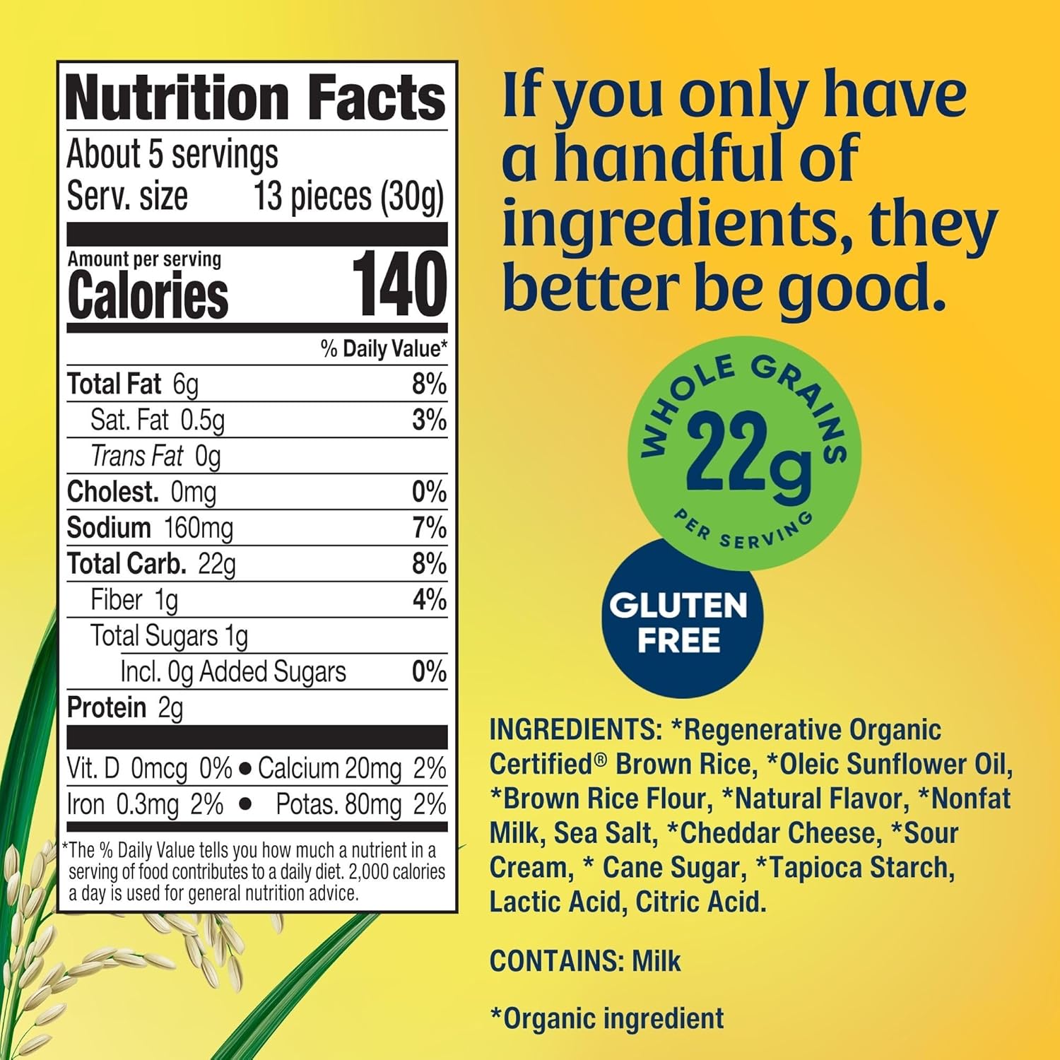 Lundberg Organic White Cheddar Rice Cake Minis, 5 oz, offers a delicious and wholesome snack option. These rice cake minis are made with regenerative organic certified brown rice and are tumbled in white cheddar cheesiness. They are USDA Organic, Non-GMO Project Verified, gluten-free, and contain 22 grams of whole grains per serving, making them a nutritious and guilt-free treat for on-the-go snacking or your next TV binge-watch.