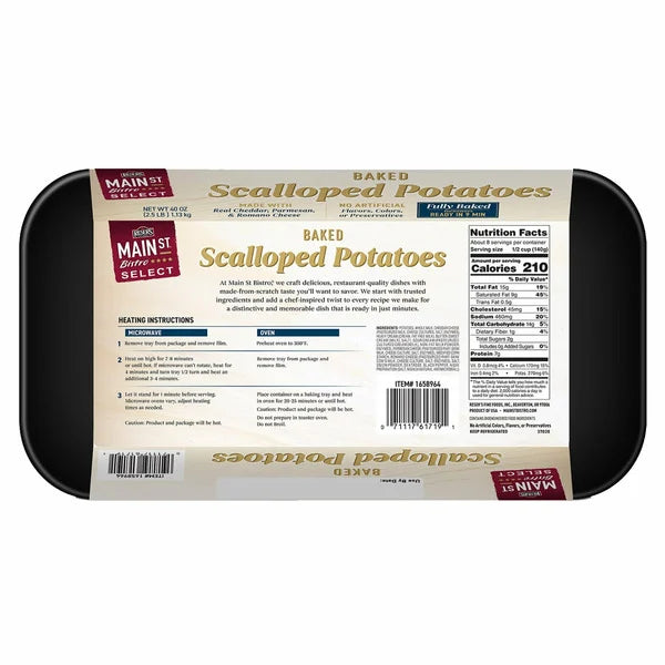 Main Street Bistro Scalloped Potatoes, 40 oz, are a ready-to-heat side dish that brings homestyle flavor to your table with ease. Made from tender, thinly sliced potatoes layered in a rich, creamy sauce and topped with a golden finish, they deliver a comforting taste that pairs perfectly with holiday meals, weeknight dinners, or special gatherings. Fully prepared and conveniently packaged, these scalloped potatoes save time in the kitchen while offering the quality and flavor of scratch-made cooking. Ideal for sharing, the generous 40-ounce size ensures there’s plenty for family and guests to enjoy.