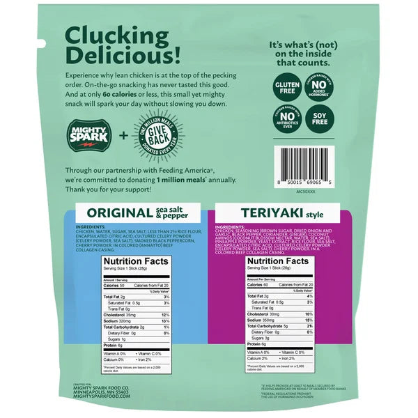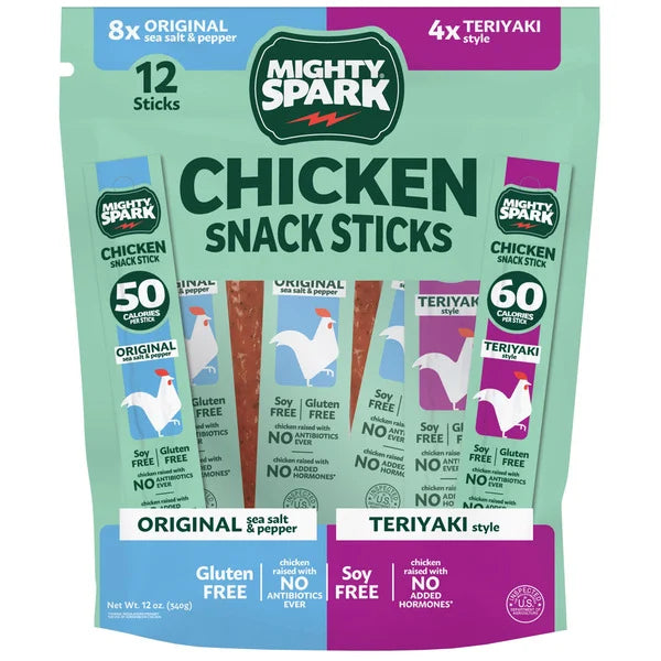 Fuel your day with bold flavor and clean protein from Mighty Spark’s Chicken Snack Stick Variety Pack. Each stick is crafted from premium cuts of chicken and seasoned to perfection—featuring a mix of Original Sea Salt & Pepper and Teriyaki Style flavors. With 60 calories or less per stick, they’re a guilt-free grab-and-go snack that fits into any lifestyle