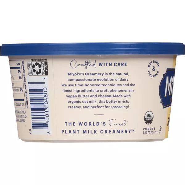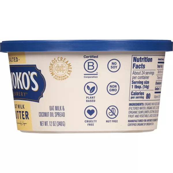 Indulge in the rich and creamy taste of Miyoko's Creamery Salted Oat Milk Butter. This 12 oz pack features a delicious blend of organic cultured oat milk, organic high oleic sunflower oil, and organic coconut oil. It's perfect for spreading on toast, sautéing vegetables, or using in any recipe that calls for butter. Made without palm oil or lactose, this butter is smooth, subtly tangy, and offers a wholesome plant-based alternative.