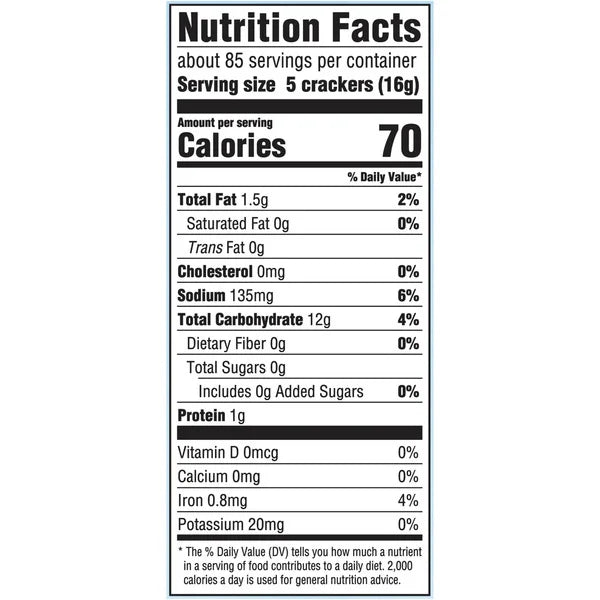 Nabisco Original Premium Saltine Crackers come in a 48 oz box containing 12 stay-fresh sleeves. These classic square-shaped crackers are lightly salted with sea salt and have a crisp, airy texture that pairs well with soups, stews, and chili. They’re also great on their own or topped with cheese, peanut butter, or spreads for a quick snack. Kosher and low in saturated fat, they offer a simple, satisfying crunch that’s been a pantry staple for generations.