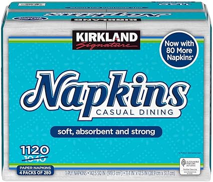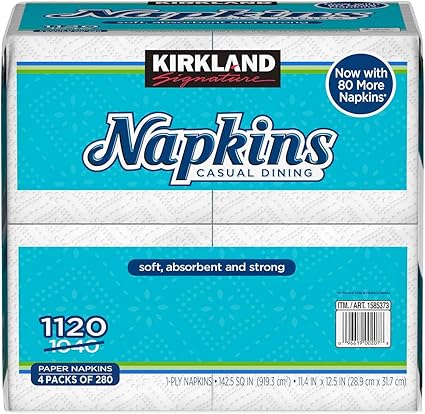 The Kirkland Signature Napkins come in a pack of four, with each pack containing 280 1-ply napkins. These napkins are soft, strong, and absorbent, making them perfect for everyday use. They measure 11.4 inches by 12.5 inches, providing ample coverage for any meal or occasion. Enjoy the convenience and quality of Kirkland Signature Napkins in your home.