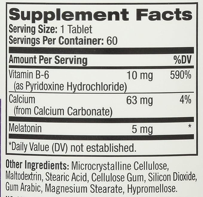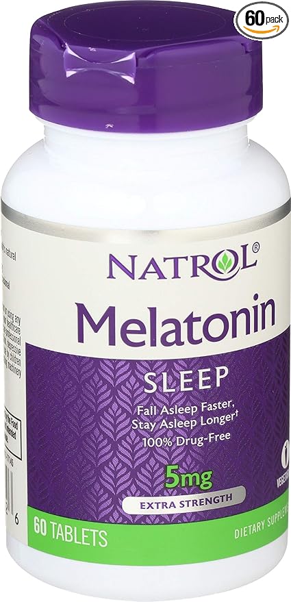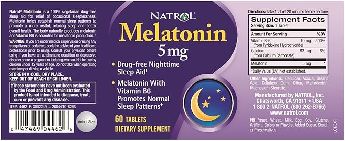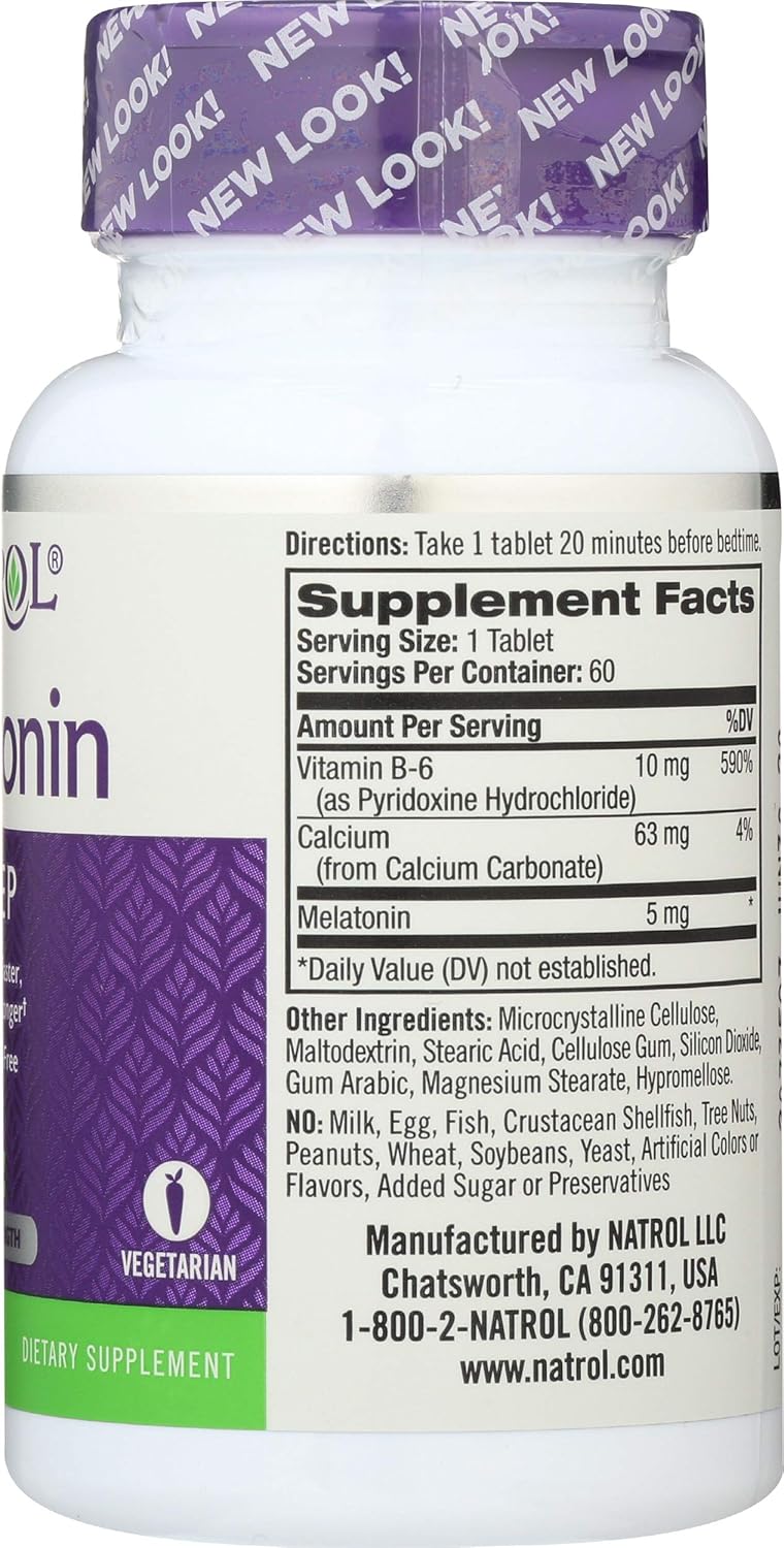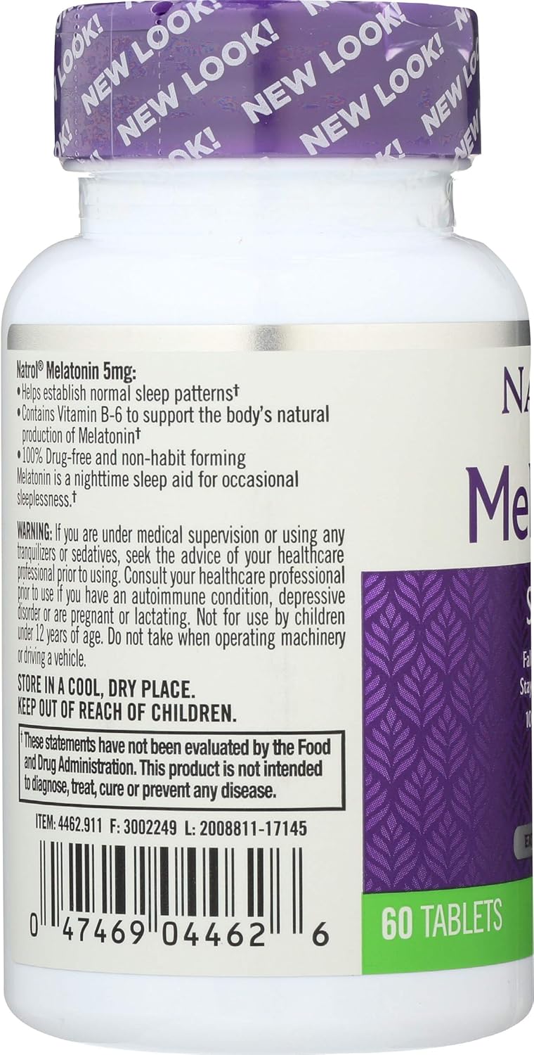 Natrol Melatonin 5 mg is a dietary supplement designed to support restful sleep. This 60-count package features tablets that provide 5 mg of melatonin per serving. Melatonin is a natural hormone that helps regulate sleep-wake cycles, making it easier to fall asleep and stay asleep. These tablets are 100% drug-free and made with no common food allergens, making them suitable for a variety of dietary needs. Enjoy the benefits of Natrol Melatonin 5 mg tablets to help improve your sleep quality and overall health.
