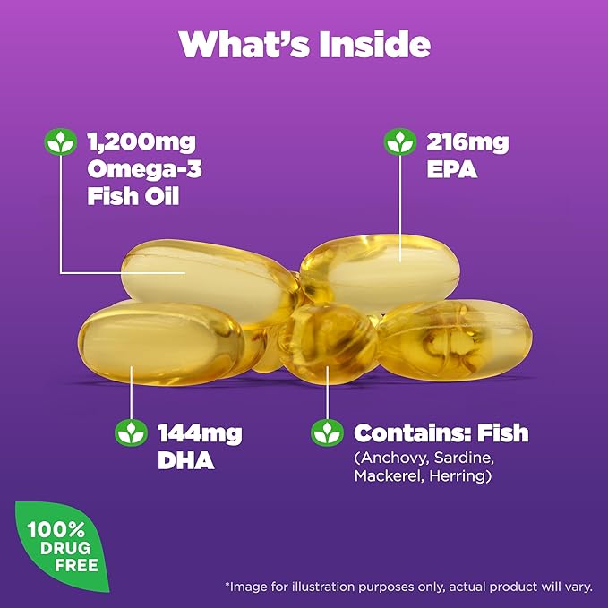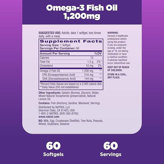 Natrol Omega-3 Fish Oil 1200 mg Softgels are a high-quality supplement designed to support heart, brain, and joint health. This 60-count package features softgels that provide 1200 mg of omega-3 fish oil, including 647 mg of EPA and 253 mg of DHA per serving. Omega-3 fatty acids are essential for maintaining cardiovascular health, reducing inflammation, and supporting cognitive function. These softgels are free from artificial colors, flavors, and preservatives, making them a reliable choice for your daily health regimen.