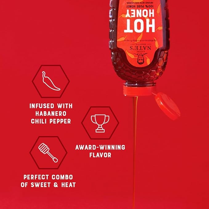 Nature Nate's Hot Honey is a 16 oz bottle of pure, natural honey infused with habanero chili pepper flakes. This combination creates a perfect balance of sweet and heat, making it a versatile condiment for various dishes. The honey is all-natural, gluten-free, and free from additives or preservatives. Perfect for drizzling on pizza, adding to cocktails, or enhancing your favorite meals, this hot honey offers a unique and flavorful twist. Enjoy the award-winning taste and quality that Nature Nate's is known for.