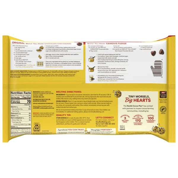 Nestle Toll House Semi-Sweet Chocolate Chip Morsels in the 4 lb 8 oz bag are made with 100% real chocolate and contain no artificial flavors, colors, or preservatives. These classic morsels are perfect for baking cookies, brownies, and other sweet treats, or for adding a rich chocolate touch to oatmeal, pancakes, and trail mix. Certified Kosher and gluten-free, they offer a smooth, creamy texture and a balanced semi-sweet flavor that makes them a versatile staple in any kitchen.