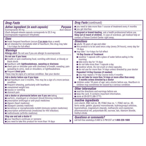 Nexium 24HR Acid Reducer 20 mg, 42 Capsules provides all-day and all-night protection from frequent heartburn. Each capsule contains esomeprazole magnesium, a proton pump inhibitor that blocks acid at the source by turning off the stomach’s acid pumps. Taken once daily before eating in the morning, it delivers 24-hour relief and is clinically proven to treat heartburn occurring two or more days a week. Full effect may take 1 to 4 days, and it's intended for a 14-day course of treatment.