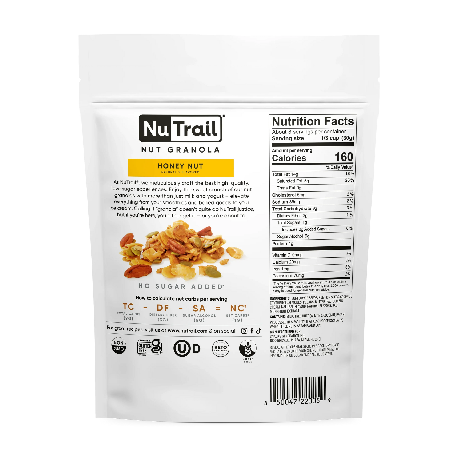 NuTrail Honey Nut Granola, 8 oz, offers a delicious and nutritious breakfast option. This granola is made with a blend of nuts and seeds, providing a buttery and crunchy texture. It is keto-certified, gluten-free, grain-free, and contains no added sugar, making it a healthy choice for those following a low-carb or ketogenic diet. Enjoy it with yogurt, milk, or as a topping for your favorite desserts.