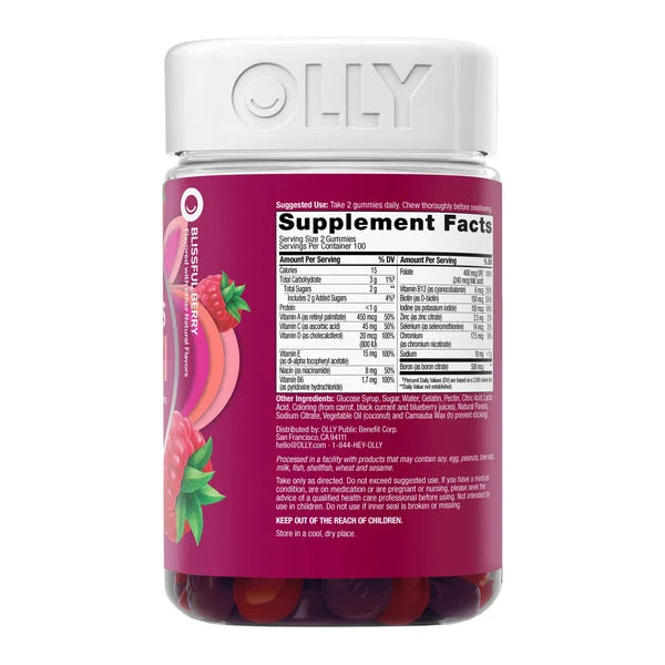 OLLY Women's Multivitamin Gummies are formulated to support overall wellness with a blend of essential nutrients including vitamins A, C, D, E, B-complex, biotin, and folic acid. These chewable gummies come in a blissful berry flavor and are designed to promote energy, immune health, bone strength, and beauty from within. The 200-count bottle offers a 100-day supply, and the gummies are gluten-free with no synthetic flavors or colors.