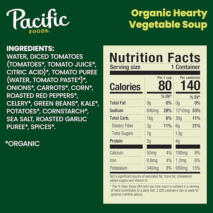 Pacific Foods Organic Hearty Vegetable Soup, 16.3 oz, offers a hearty and nutritious meal option. This plant-based soup features a blend of organic vegetables, including tomatoes, green beans, and red bell peppers, seasoned with a delightful mix of herbs and spices. It is USDA Certified Organic, gluten-free, and made with non-GMO ingredients, ensuring a wholesome and delicious choice for your meals. Each can contains 70% of the recommended daily value of vegetables, making it a satisfying and nourishing option for lunch or dinner. Enjoy the rich flavors and quality ingredients of Pacific Foods Organic Hearty Vegetable Soup, a perfect addition to your pantry.