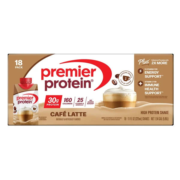 Premier 30g Protein Shakes in Café Latte flavor come in an 18-pack of 11 fl oz bottles, offering a smooth, coffee-inspired taste with the added benefit of caffeine equivalent to a cup of coffee. Each shake delivers 30 grams of protein to help support muscle health and curb hunger, along with 25 vitamins and minerals for energy and immune support. With just 1 gram of sugar and 3 grams of fat per serving, it's a low-calorie, convenient option for breakfast, post-workout recovery, or a midday boost.