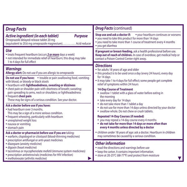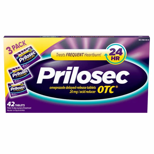 Prilosec OTC 20 mg Tablets are designed to treat frequent heartburn by reducing the amount of acid in the stomach. Each tablet contains omeprazole delayed-release, a proton pump inhibitor that provides 24-hour relief when taken once daily for 14 days. This package includes 42 tablets, offering a convenient and effective solution for managing heartburn symptoms over an extended period.