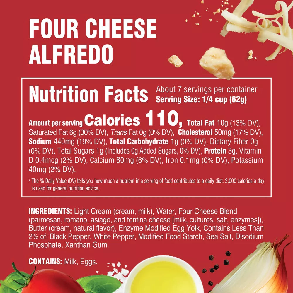 Rao's Four Cheese Alfredo, 15 oz, offers a rich and creamy addition to your meals. This premium sauce is made with a blend of four Italian-style cheeses: Parmesan, Romano, Asiago, and Fontina, combined with cream and butter. It is slow-cooked to perfection, providing a decadent and well-balanced taste. The sauce is all-natural, keto-friendly, and contains no added sugar, making it a wholesome choice for your pasta dishes.