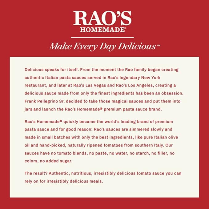Rao's Homemade Marinara Sauce, 15.5 oz, is a premium, slow-cooked Italian pasta sauce that brings the classic flavor of homemade tomato sauce to your kitchen. Made with high-quality ingredients, including Italian tomatoes, olive oil, onions, garlic, basil, and oregano, this sauce offers a rich and authentic taste. Free from added sugars and artificial preservatives, it is a wholesome and versatile option for enhancing your favorite pasta dishes, pizzas, and recipes. Enjoy the delicious and traditional flavor of Rao's Homemade Marinara Sauce, perfect for any meal.