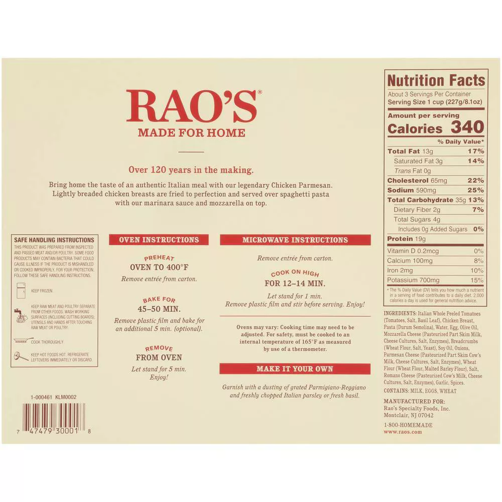 Enjoy the classic Italian flavors of Rao's Made For Home Family Size Frozen Chicken Parmesan. This 25 oz package features crispy breaded chicken breasts, Italian tomatoes, and durum semolina pasta, all topped with delicious mozzarella cheese. Perfect for a quick and hearty meal, this frozen dish offers the authentic taste of Rao's without any preservatives, artificial colors, or flavors. Simply heat and serve for a satisfying and convenient dinner option.