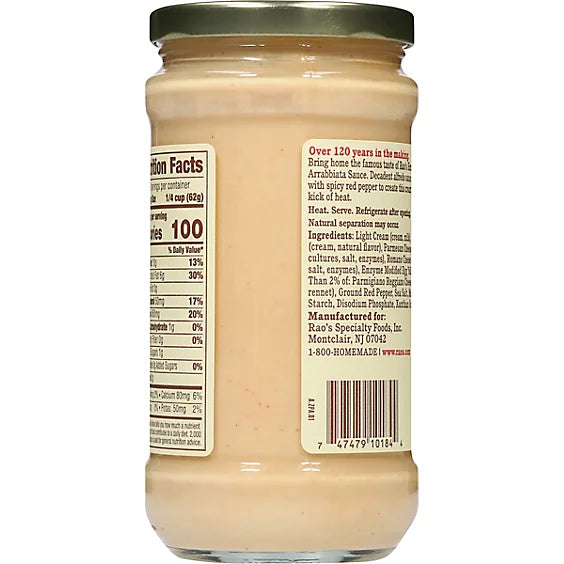 Rao's Sauce Alfredo Arrabbiata, 15 oz, offers a rich and spicy addition to your meals. This premium sauce combines decadent Alfredo with a kick of heat from spicy red pepper. Made with high-quality ingredients, including light cream, Parmesan cheese, and Romano cheese, it provides a creamy and flavorful taste. The sauce is all-natural, keto-friendly, and contains no added sugar, making it a wholesome choice for your pasta dishes.
