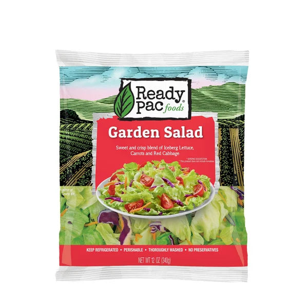 Ready Pac Bistro Garden Salad, 12 oz, is a fresh blend of iceberg lettuce, carrots, and red cabbage. Thoroughly washed and ready to serve, it contains no preservatives and is packaged to maintain crispness and quality. Each serving has just 15 calories, making it a light and healthy base for meals or a quick side dish. You can enjoy it on its own or top it with your favorite dressing, proteins, or crunchy additions for a more complete salad experience.