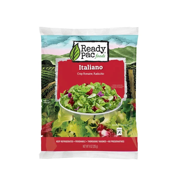 Ready Pac Bistro Italiano Salad, 9 oz, is a simple yet bold mix of crisp romaine and robust radicchio. It’s inspired by Italian flavors, offering a crunchy texture and slightly bitter edge that pairs beautifully with savory toppings like salami, parmesan, or a classic vinaigrette. The greens are thoroughly washed and packed to stay fresh without preservatives, making it a quick grab for salads, wraps, or side dishes. Each serving has just 15 calories, with a bit of fiber and vitamin A to round it out.