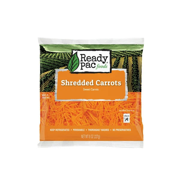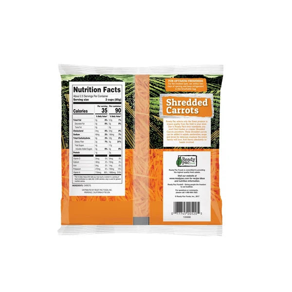 Ready Pac Bistro Shredded Sweet Carrots, 8 oz, delivers fresh, pre-washed carrots with a naturally sweet flavor and crisp texture. Each serving has just 35 calories, with 2 grams of fiber and 4 grams of natural sugars, making it a light and nutritious addition to salads, wraps, or stir-fries. The carrots are shredded for convenience and contain no preservatives, so they’re ready to use straight from the bag. Keep them refrigerated and enjoy within a few days for best quality.