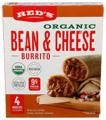 Red's Organic Bean and Cheese Burrito, 4 Count, brings a wholesome and flavorful meal option to your table. These burritos are made with certified organic ingredients, including hearty beans, rich cheddar cheese, brown rice, and a blend of flavorful spices, all wrapped in an organic tortilla. Perfect for a quick lunch or dinner, they are easy to prepare—simply heat in the microwave or oven. Each burrito is non-GMO and provides a good source of protein and fiber, making them a nutritious and satisfying choice. Enjoy the taste and quality of Red's Organic Bean and Cheese Burrito, crafted with care and commitment to health and authenticity.