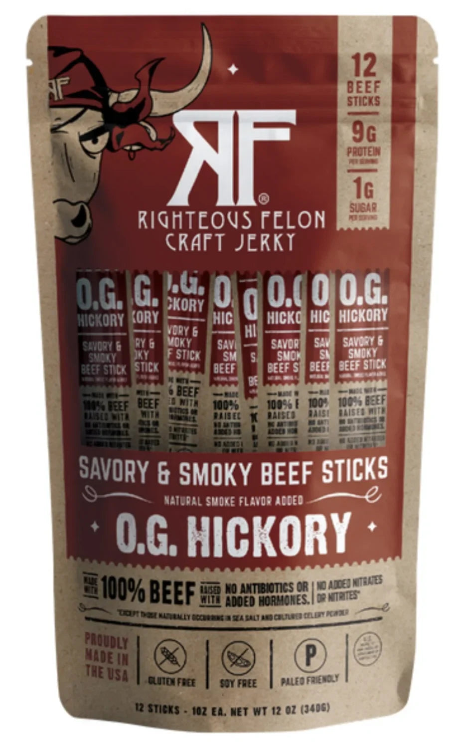 Righteous Felon Craft Jerky, O.G. Hickory Beef Stick, 1 oz, 12-count