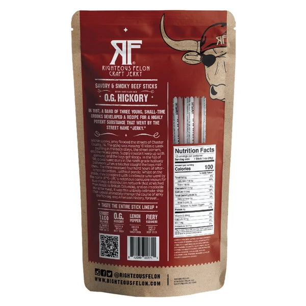Righteous Felon Craft Jerky O.G. Hickory Beef Stick, 1 oz, 12-count, features classic smoky and savory beef sticks seasoned with garlic, onion, cracked pepper, and sea salt. Made with 100% all-natural beef, each stick delivers 9 grams of protein and only 1 gram of sugar. These snacks are gluten-free, soy-free, paleo-friendly, and contain no antibiotics or added hormones. Individually packaged and proudly made in the USA, they offer a bold flavor and convenient protein boost for on-the-go snacking.
