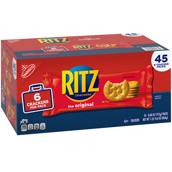 Ritz Crackers The Original, 45 Count features individually wrapped snack packs, each containing six buttery, flaky crackers. With a rich flavor and light texture, these crackers are perfect for pairing with cheese, meats, spreads, or enjoying on their own. The convenient portion packs make them ideal for lunches, picnics, parties, or on-the-go snacking. The packaging helps maintain freshness and reduces breakage, offering a reliable and tasty option for any occasion.