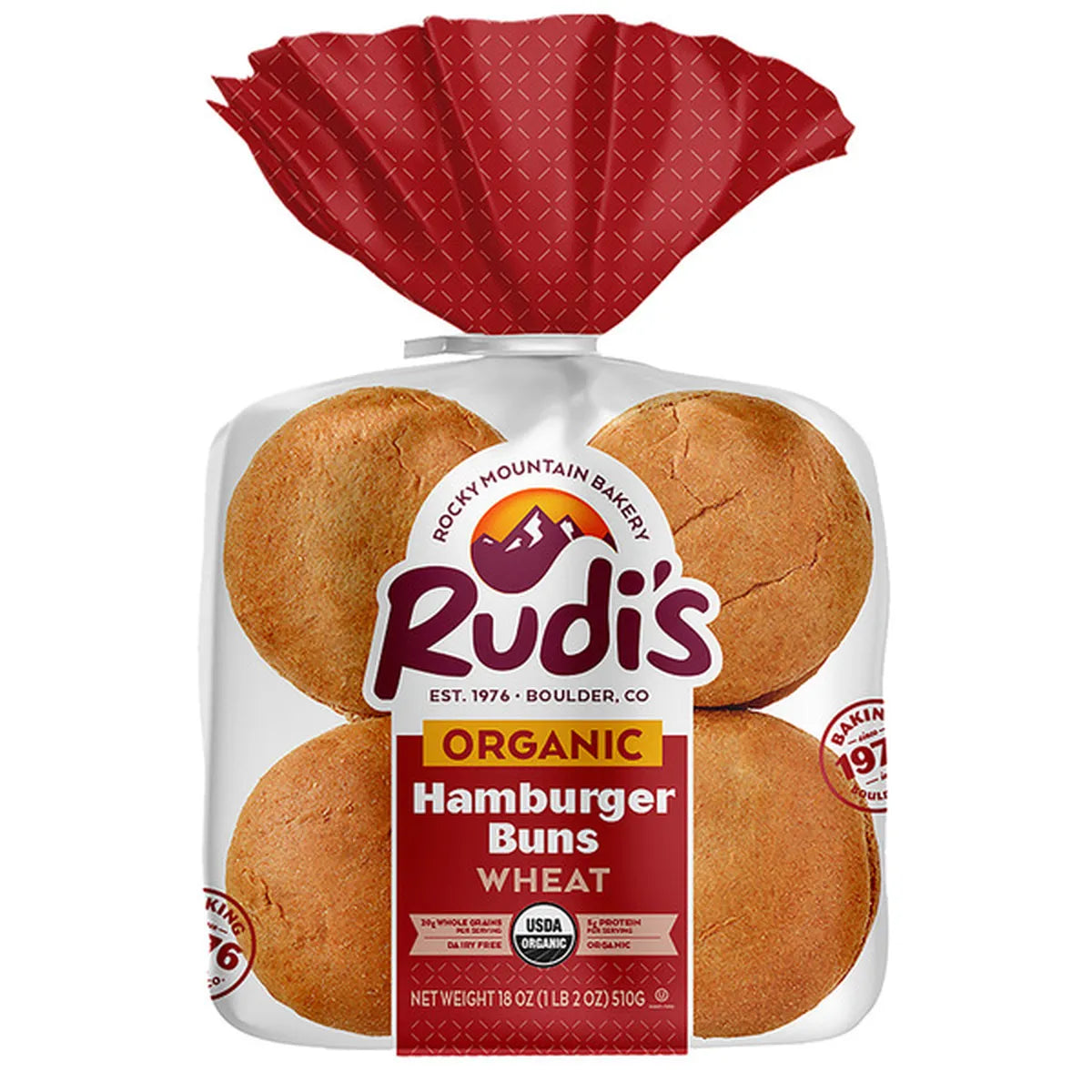 Rudis Organic Bakery Hamburger Buns, Wheat Are Small Batch Baked, Certified Kosher-parve, Non-gmo and Made With Organic Ingredients. Every 18 Ounce Bag of Rudis Organic Wheat Hamburger Buns Contains 0 G. of Trans Fat and Cholesterol and No High Fructose Corn Syrup.