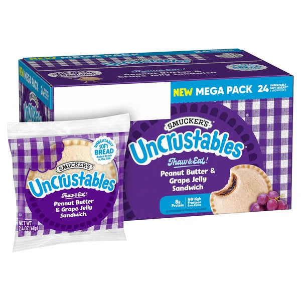 Classic comfort meets grab-and-go convenience with Smucker’s Uncrustables. These frozen, crustless sandwiches are filled with creamy peanut butter and sweet grape jelly, sealed inside soft white bread for a mess-free snack that’s ready when you are. Just thaw and enjoy—no prep required.