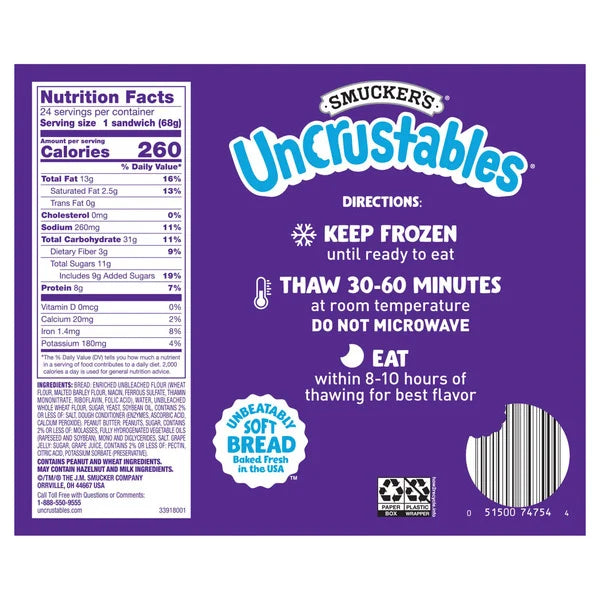 Smucker's Uncrustables, Peanut Butter & Grape Jelly Sandwich, 2.4 oz, 24 ct