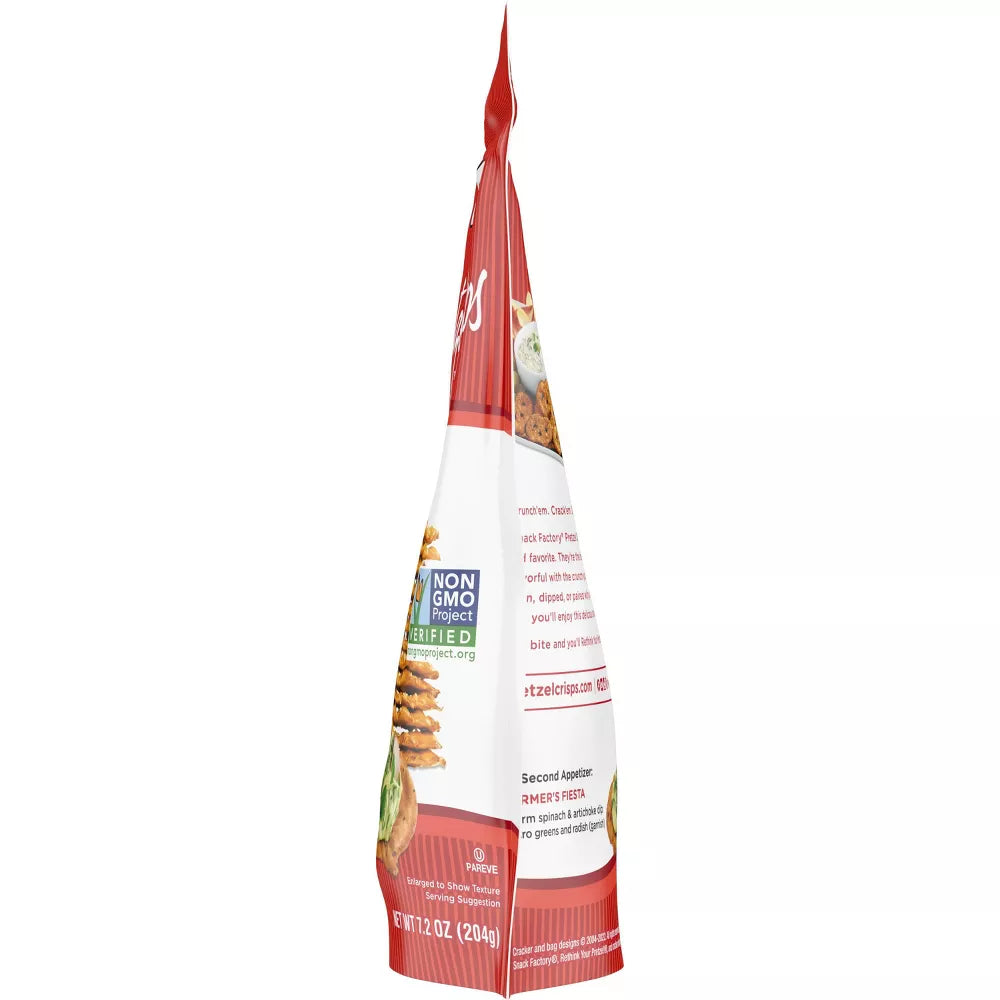 Snack Factory Everything Pretzel Crisps, 7.2 oz, offers a delicious and savory snack option. These pretzel crisps are thin, crunchy, and seasoned with a blend of poppy seeds, sesame seeds, onions, garlic, and salt, providing the perfect "everything" flavor. They are Non-GMO Project Verified and contain no artificial colors, flavors, or preservatives. Perfect for enjoying on their own or paired with your favorite dips, cheeses, or spreads, these pretzel crisps are a satisfying and flavorful choice.