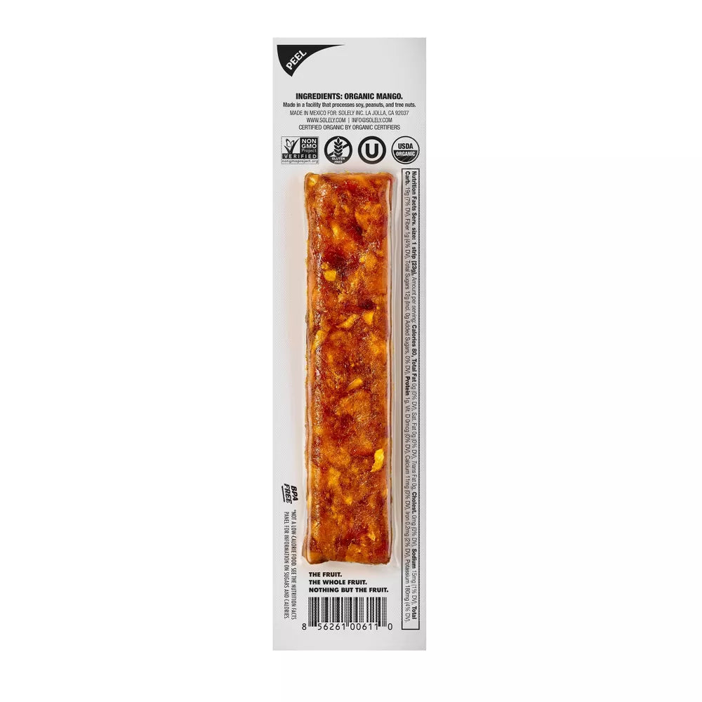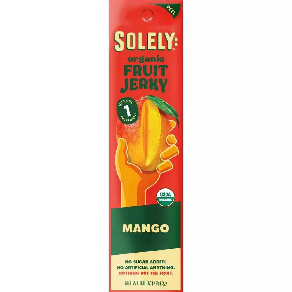 Solely® Organic Mango Fruit jerky is made with only 1 Ingredient: A whole, organic mango. Yes, really. We believe in transparency, and we use whole and simple ingredients listed on the front of our package. Never added sugar, preservatives or from concentrate.