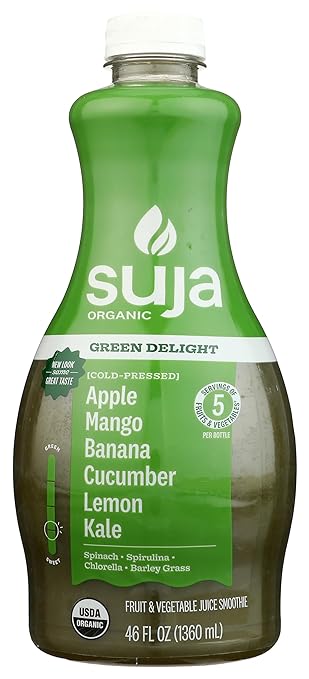 Suja Organic Green Delight Juice is a delicious and nutritious beverage. Each 46 oz bottle is packed with organic ingredients, including apple juice, mango puree, banana puree, cucumber juice, lemon juice, kale juice, spinach juice, spirulina powder, chlorella powder, and barley grass powder. This cold-pressed juice is designed to provide a natural boost with 5 servings of fruits and vegetables per bottle. It contains no added sugar and is an excellent source of vitamin C. Suja Organic Green Delight Juice is USDA organic, non-GMO, vegan, and gluten-free, making it a healthy and convenient way to enjoy a refreshing and nutrient-rich drink.