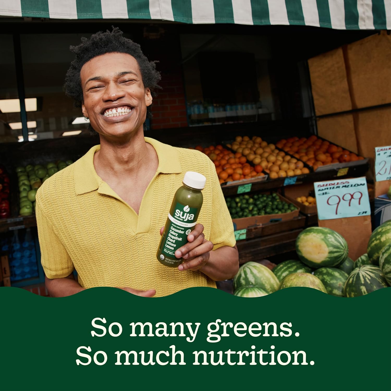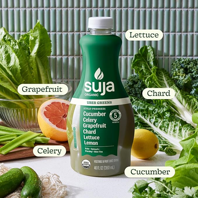 Suja Organic Uber Greens Juice is a nutrient-dense and refreshing beverage. Each 46 oz bottle is packed with organic ingredients, including cucumber juice, celery juice, grapefruit juice, green chard juice, green leaf lettuce juice, lemon juice, kale juice, spinach juice, parsley juice, and mint tea. This cold-pressed juice is designed to provide a natural boost with 5 servings of fruits and vegetables per bottle. It contains no added sugar and is an excellent source of potassium, vitamin C, and vitamin K. Suja Organic Uber Greens Juice is USDA organic, non-GMO, vegan, and gluten-free, making it a healthy and convenient way to get your greens.