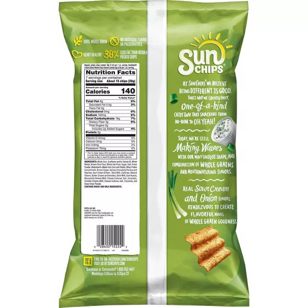 Sun Chips French Onion Whole Grain Snacks, 7 oz, bring a bold twist to your snack game. These wavy chips are crafted from a blend of whole grains—including corn, wheat, brown rice flour, and oat flour—and infused with tangy French onion flavor. Each serving delivers 21g of whole grains and contains no artificial flavors or preservatives, making them a crunchy, flavorful option that’s both satisfying and wholesome.