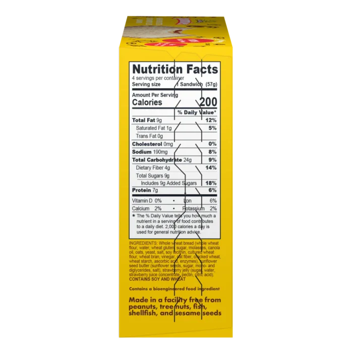 SunButter Natural Strawberry Jelly Sandwich Jammies are a delightful and nutritious snack option. Each 8 oz pack contains individually wrapped sandwiches made with whole wheat bread, sunflower seed butter, and strawberry jelly. These sandwiches are nut-free, making them a safe choice for those with nut allergies. They are also free from artificial flavors, sweeteners, and preservatives, ensuring a wholesome and natural snack. With 7 grams of protein per serving, SunButter Natural Strawberry Jelly Sandwich Jammies offer a satisfying and convenient option for on-the-go snacking or lunchboxes.