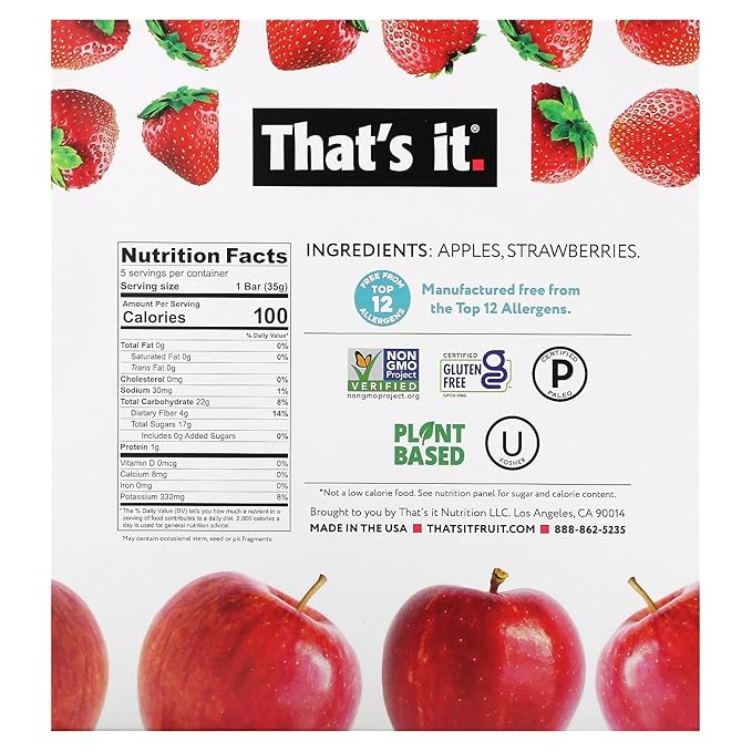 That's It Strawberry Fruit Bars come in a 5-count package. These bars are made with only two ingredients: apples and strawberries, with no added sugar, preservatives, or artificial flavors. Each bar is gluten-free, non-GMO, vegan, and kosher-certified, making them a wholesome and convenient snack option. Packed with natural fruit goodness, they are perfect for on-the-go snacking or a healthy treat.