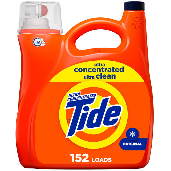 Tide Liquid Laundry Detergent in the 170 fluid ounce size is ultra concentrated and designed for high-efficiency washing machines. It delivers a deep clean with the classic Original Scent and is formulated to work in top-load, front-load, and HE machines. This phosphate-free detergent provides up to 152 loads per container, offering powerful stain removal even in cold water. It's a reliable choice for keeping clothes fresh and bright with every wash.