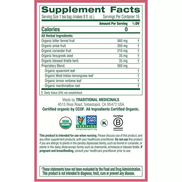Traditional Medicinals Organic Original with Fennel & Fenugreek Mother's Milk Tea, 16 Count, offers a soothing and beneficial option for nursing mothers. This tea is made with a blend of organic fennel, fenugreek, anise, coriander, and blessed thistle, providing a sweet and distinct licorice flavor. It is caffeine-free, USDA Certified Organic, and Non-GMO Project Verified. This tea is perfect for promoting healthy lactation and supporting overall well-being during breastfeeding.