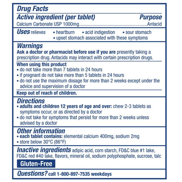 TUMS Antacid Ultra Strength chewable tablets provide fast-acting relief from heartburn, acid indigestion, and sour stomach. Each tablet contains 1000 mg of calcium carbonate, which neutralizes excess stomach acid on contact. The tablets come in assorted berry flavors and are gluten-free. With 265 tablets per bottle, it's a convenient option for regular use at home or on the go.