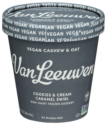 Van Leeuwen Cookies & Cream Caramel Swirl Non-Dairy Ice Cream is a delightful and indulgent treat. Each 14 oz pint is made with a creamy vegan base, featuring cream-filled dark chocolate cookies, a touch of cold-ground Tahitian vanilla, and a swirl of house-made caramel. This non-dairy ice cream is crafted with simple, high-quality ingredients, ensuring a rich and satisfying flavor. Enjoy the delicious taste and quality ingredients of Van Leeuwen Cookies & Cream Caramel Swirl Non-Dairy Ice Cream.