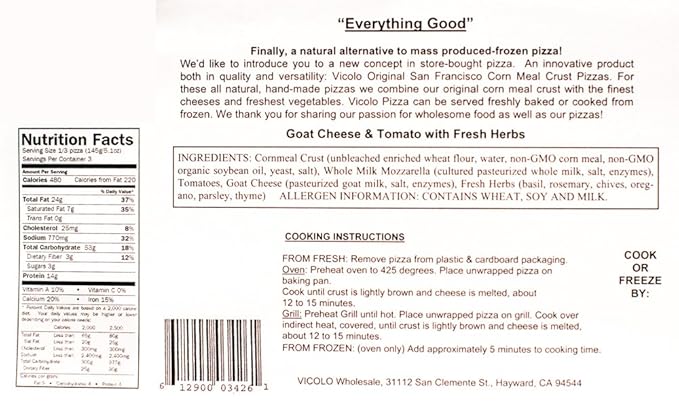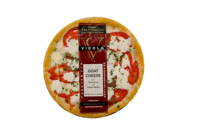 Vicolo Goat Cheese Frozen Pizza is a delicious and convenient meal option. Each 15.25 oz pizza features a unique San Francisco-style cornmeal crust, topped with tangy goat cheese, sun-dried tomatoes, and fresh herbs like basil, rosemary, chives, oregano, parsley, and thyme. This all-natural, hand-made pizza is free from high fructose corn syrup and preservatives, ensuring a wholesome and flavorful experience. Perfect for a quick and satisfying meal, enjoy the rich taste and quality ingredients of Vicolo Goat Cheese Frozen Pizza.